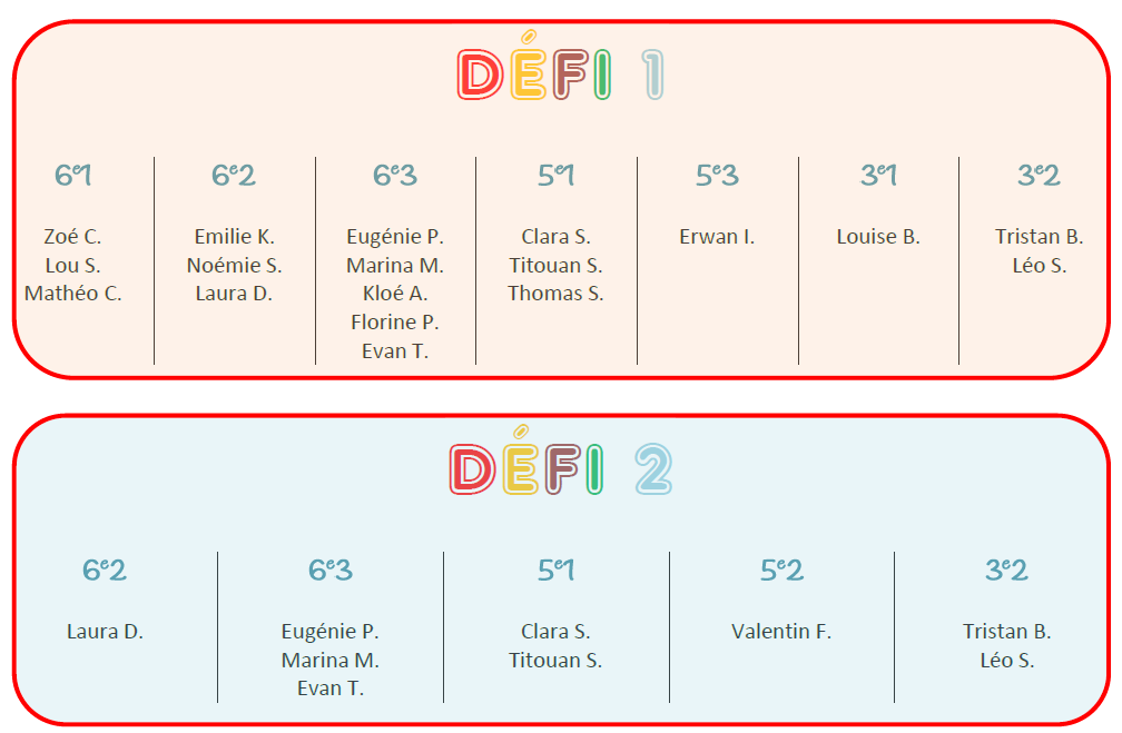 Merci et bravo à tous les participants, qu’ils aient fait un seul défi ou les deux ; qu’ils aient donné les bonnes réponses ou non ! Bravo aux élèves de 6e qui ont été les plus nombreux à participer !